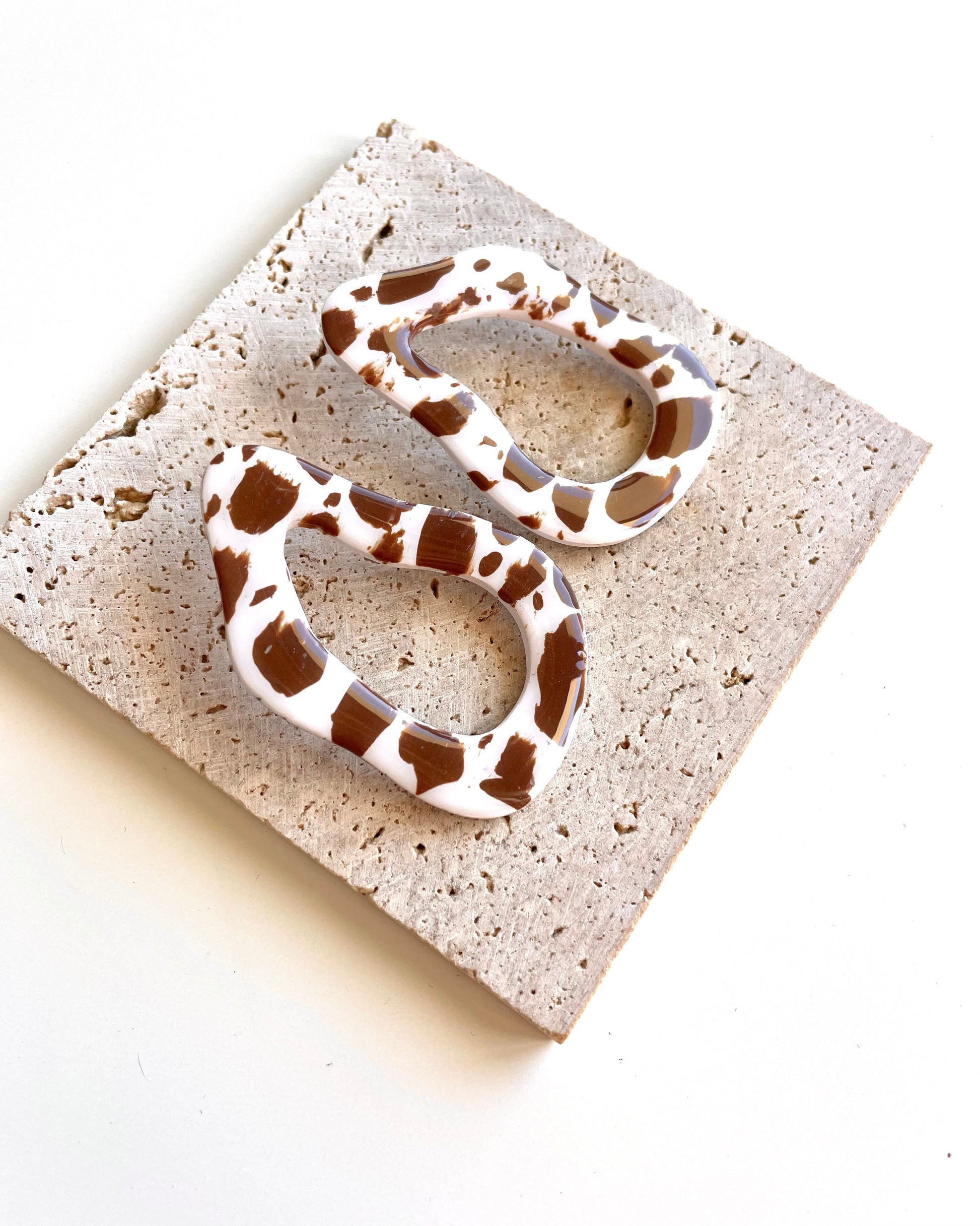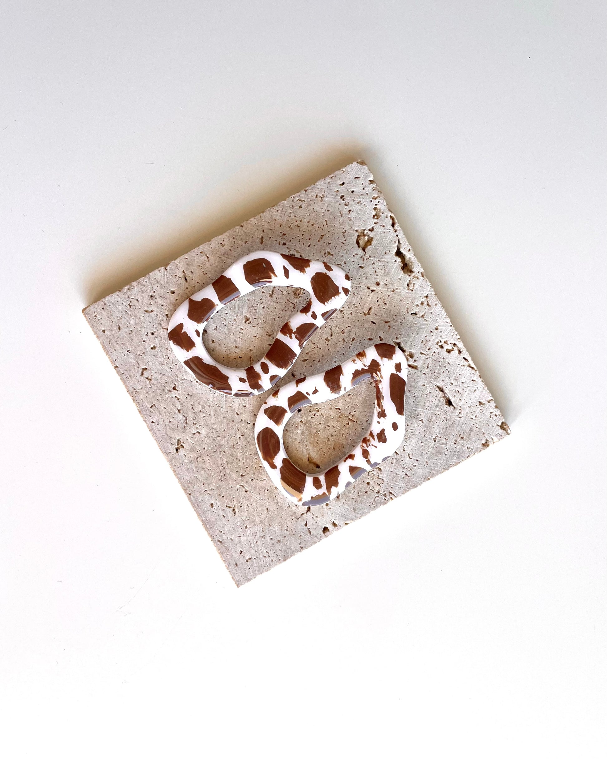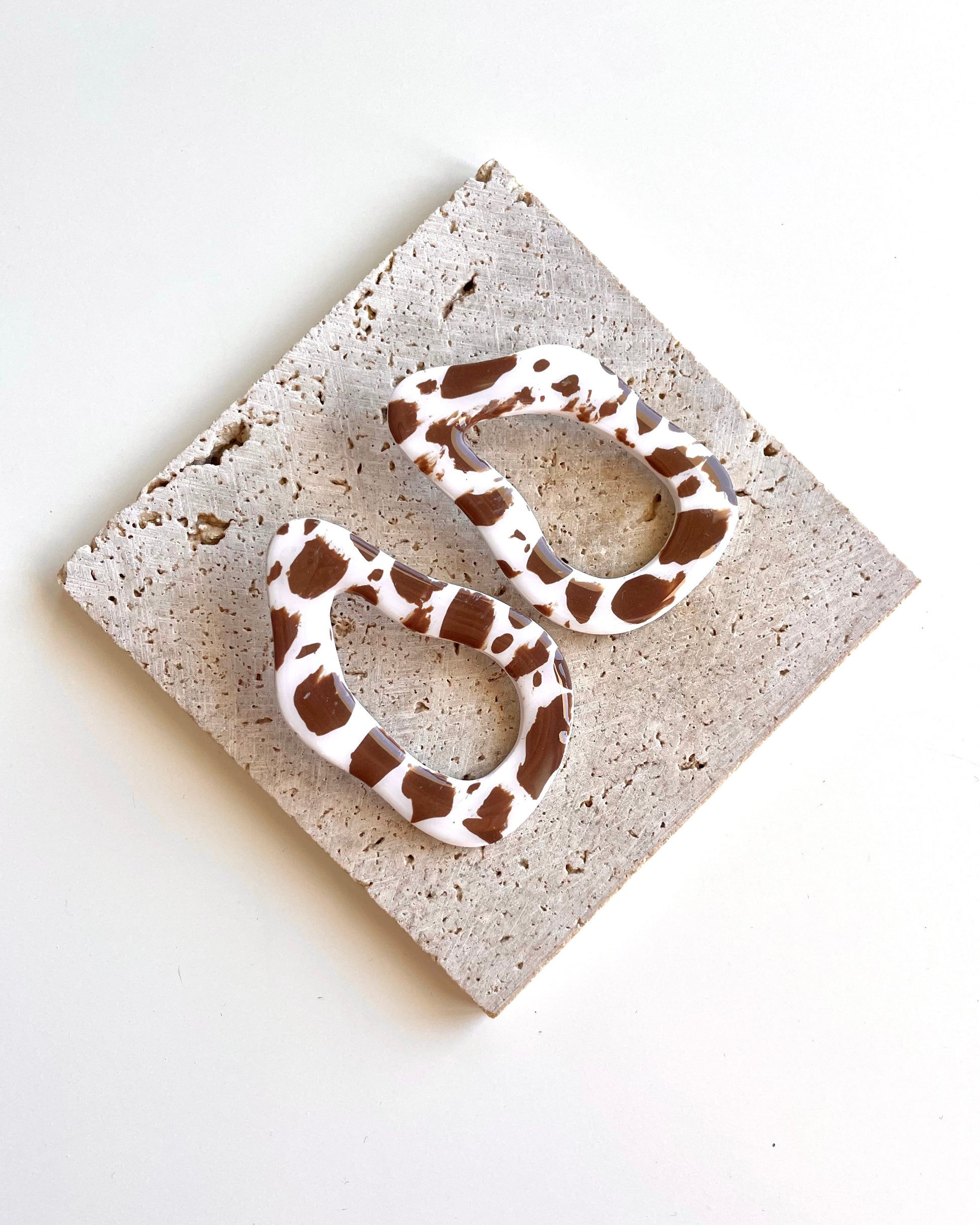 Os Forma Livre celebram a liberdade e a imperfeição como arte. Criados em formato geométrico irregular e pintados à mão no padrão cow print, cada par é totalmente exclusivo.