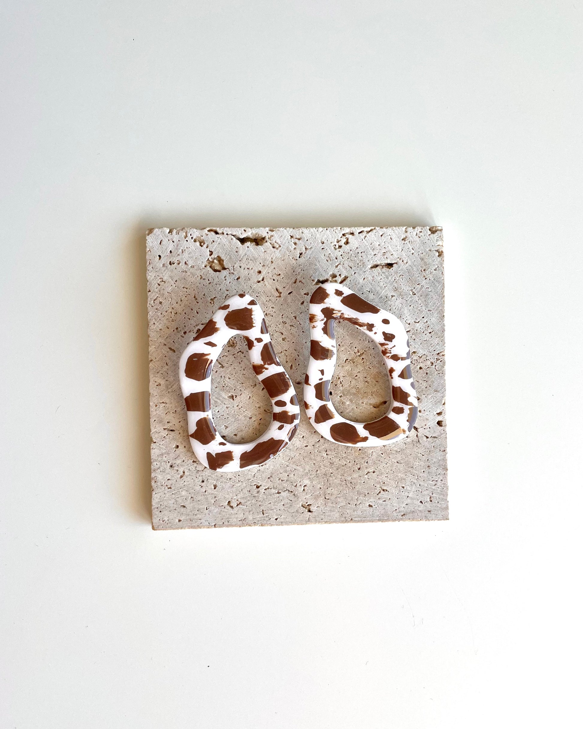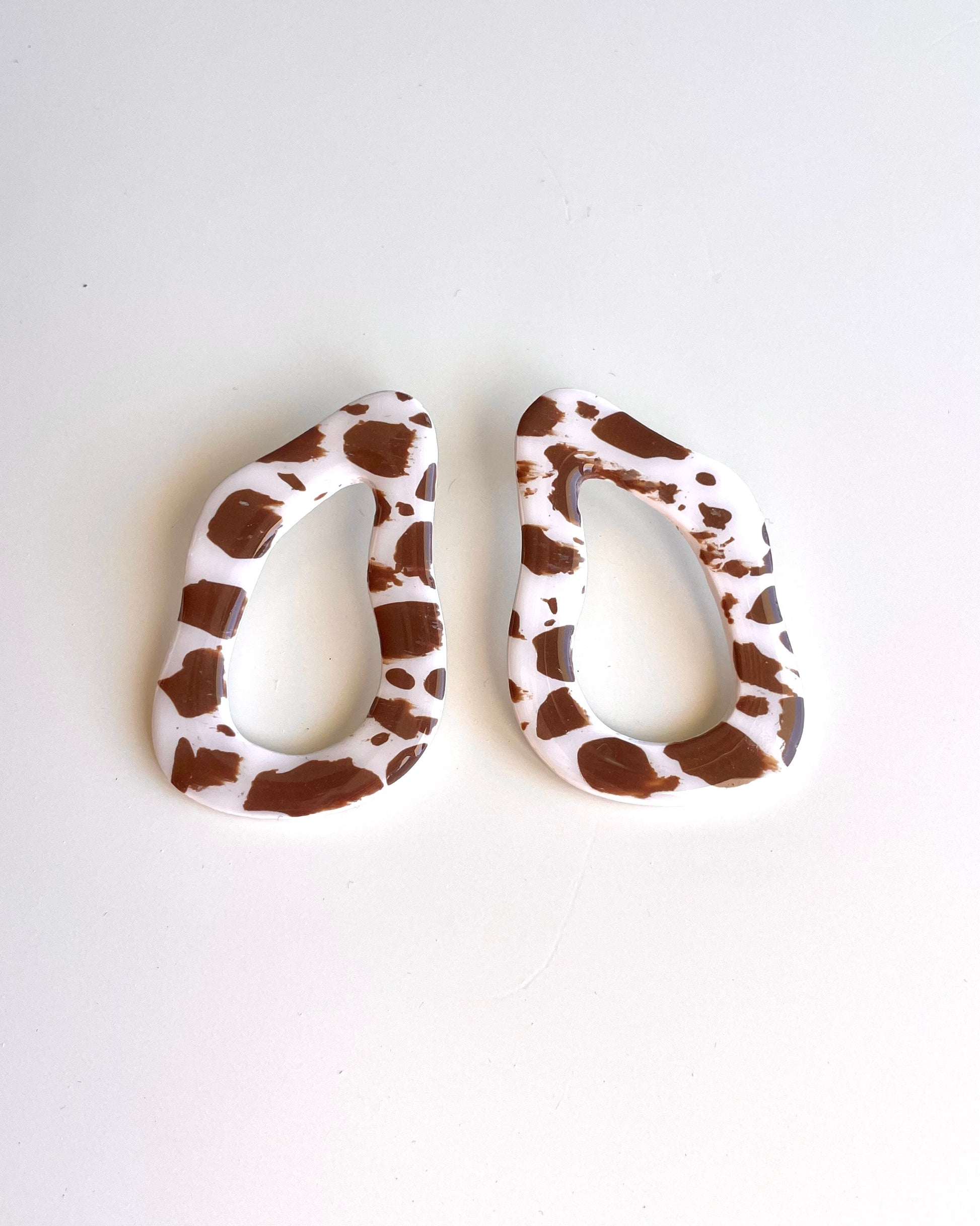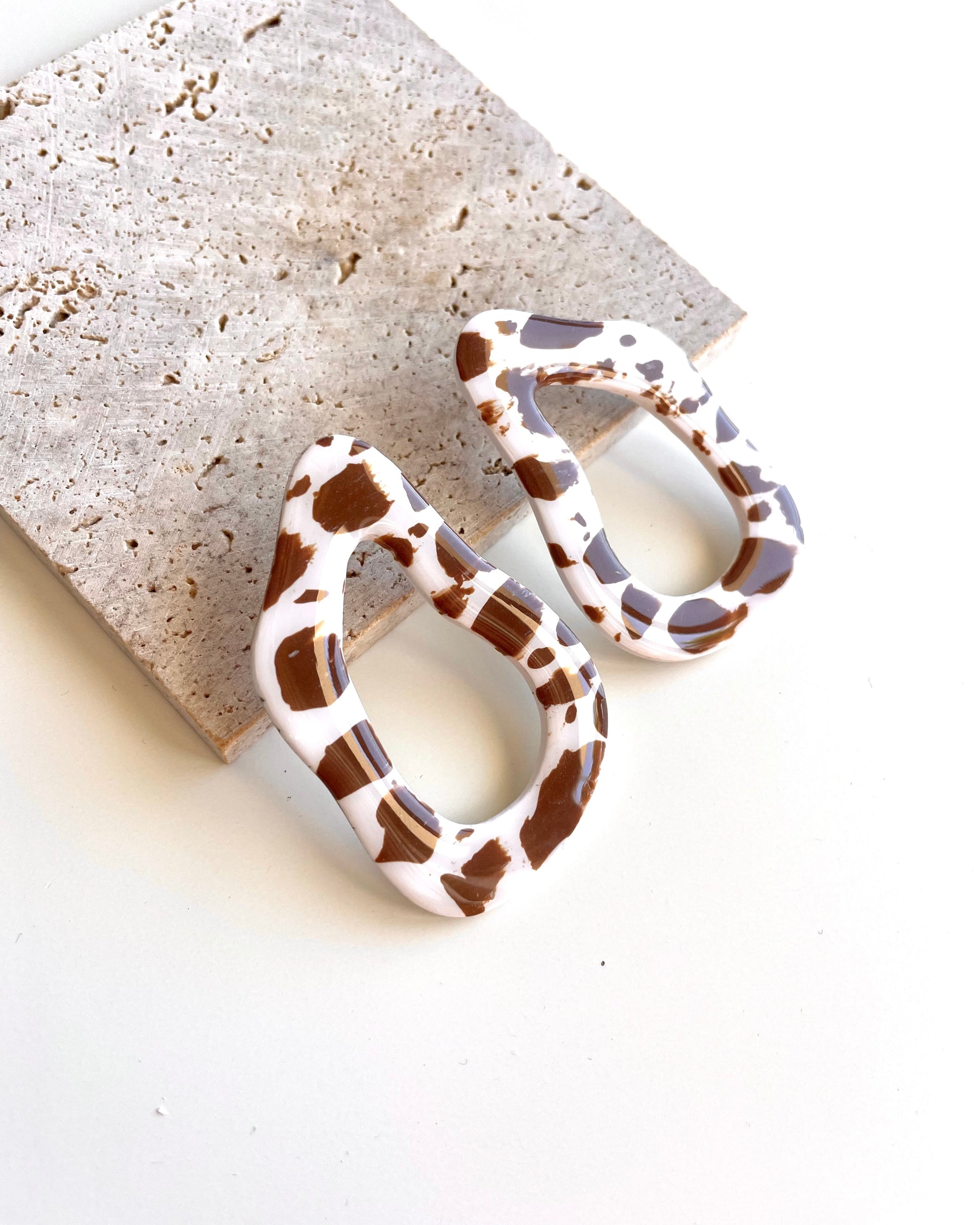 Os Forma Livre celebram a liberdade e a imperfeição como arte. Criados em formato geométrico irregular e pintados à mão no padrão cow print, cada par é totalmente exclusivo.